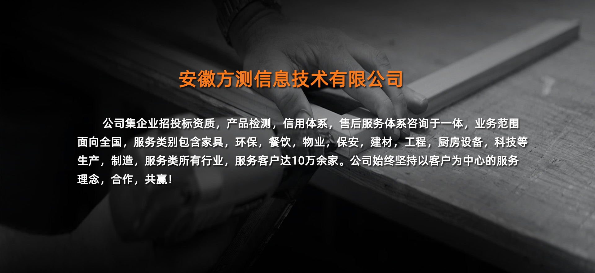 安徽方測(cè)信息技術(shù)有限公司是一家專(zhuān)業(yè)從事企業(yè)資質(zhì)認(rèn)證檢測(cè)咨詢(xún)業(yè)務(wù)的綜合性認(rèn)檢一站式服務(wù)機(jī)構(gòu),公司位于安徽省合肥市,公司集企業(yè)招投標(biāo)資質(zhì),產(chǎn)品檢測(cè),信用體系,售后服務(wù)體系咨詢(xún)于一體,業(yè)務(wù)范圍面向全國(guó),服務(wù)類(lèi)別包含家具,環(huán)保,餐飲,物業(yè),保安,建材,工程,廚房設(shè)備,科技等生產(chǎn),制造,服務(wù)類(lèi)所有行業(yè),服務(wù)客戶(hù)達(dá)10萬(wàn)余家。公司始終堅(jiān)持以客戶(hù)為中心的服務(wù)理念,合作,共贏!